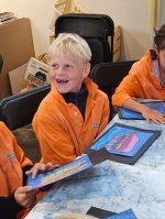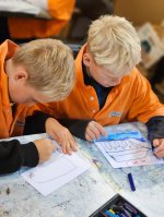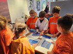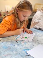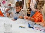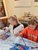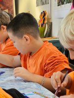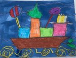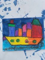 Nach der Führung wartete ein kreativer Höhepunkt: Im Workshop konnten die Kinder selbst im Stil Hundertwassers malen und gestalten. Mit bunten Wachsmalkreiden entstanden fantasievolle Bilder. Im Zentrum der Werke stand ein Boot, das wir mit eigenen Elementen ergänzen durften. Anschließend wurde der Hintergrund mit einer besonderen „Zauberfarbe“ bestrichen, die alles in ein leuchtendes Blau tauchte. Zum Schluss kamen noch goldene Akzente hinzu – so wurden die Kunstwerke zu echten kleinen Meisterwerken.